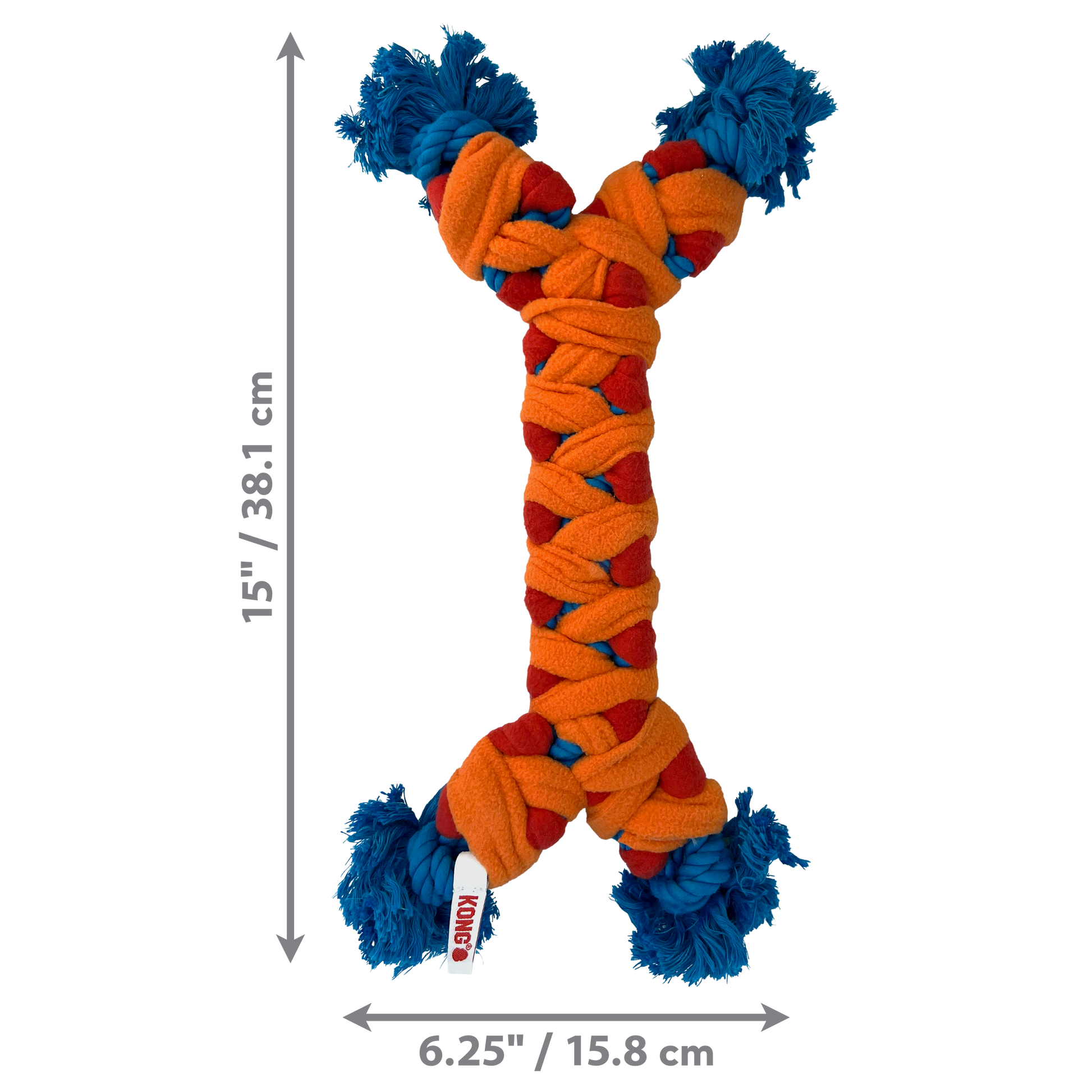 KONG Rope Rally Bone is the ideal toy for dogs who like to tug and play rough with soft toys. Strong inner core rope is woven together with a top layer of soft fleece, making the perfect interactive toy. The bone shape is ideal for shaking, fetching, and tugging. The outer fleece layer helps to gently brush dogs’ teeth as they tug and bite.