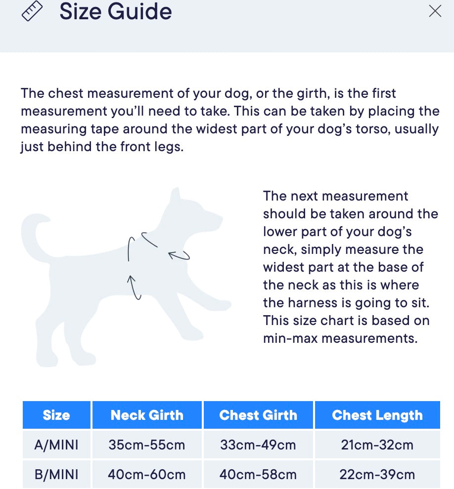 This MINI TRI-Harness features the same design as our regular TRI-Harnesses, with the only difference being the width of the harness and the smaller size guide. The harness material measures 2.5 cm in width, compared to the regular 4 cm width, making it an excellent choice for puppies and small or growing dog breeds.